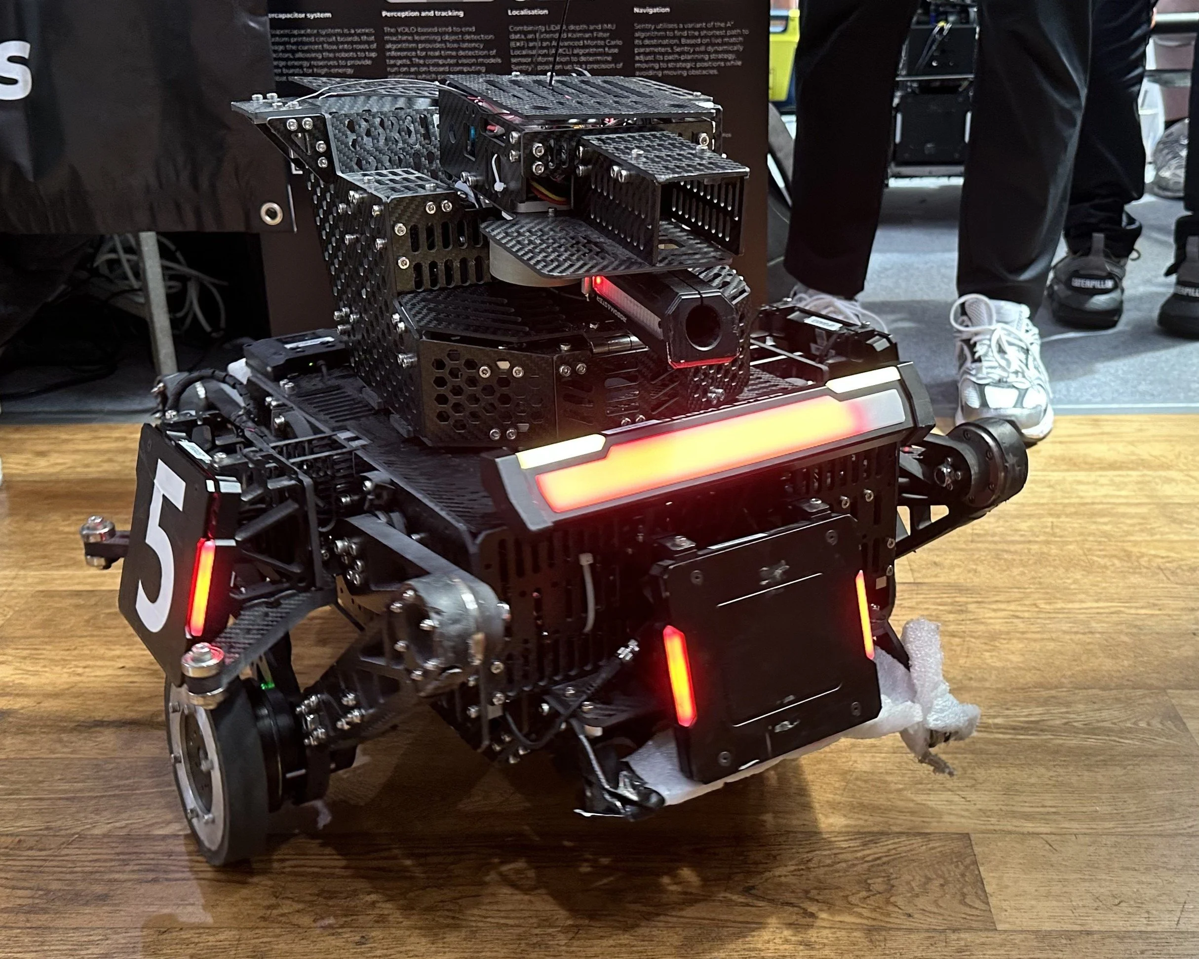 The Sentry is an autonomous robot equipped with an independent projectile launcher for base protection and area control. Integrated onboard computing, cameras, and LiDAR sensors enable machine learning–driven perception, object tracking, and path-planning algorithms for efficient navigation and intelligent positioning. This combination of AI-based localization and real-time autonomy enhances its ability to patrol, survey, and operate effectively in dynamic environments.